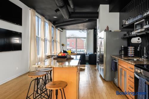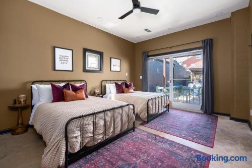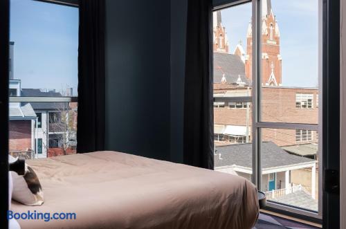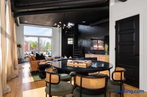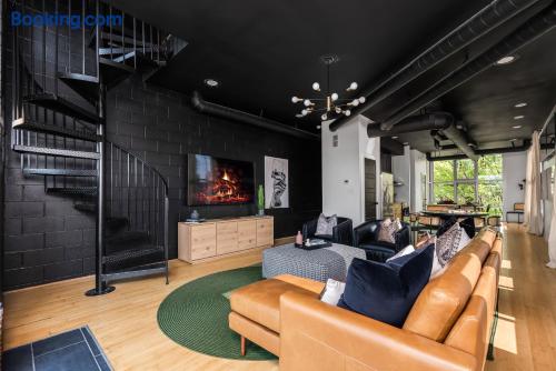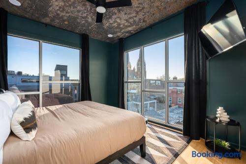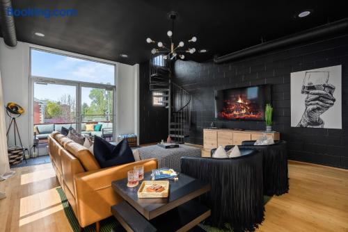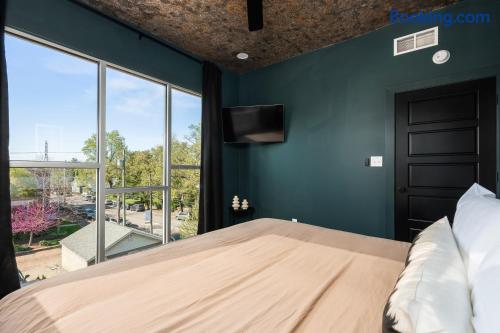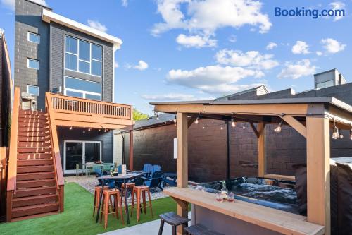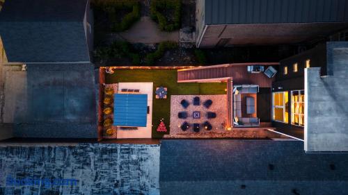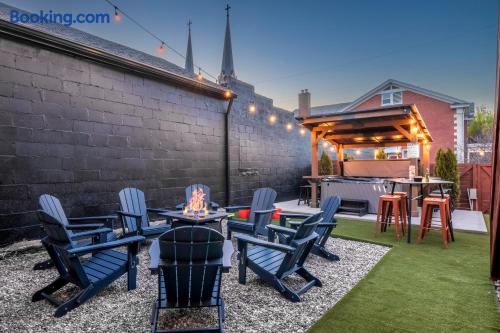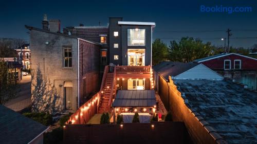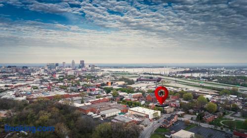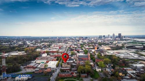 This amazing 3-story, 6-bedroom, 4.5- bath home offers a bold stay spread throughout 3000sqft and amazing amenities. The home can handle large groups and families. We have 3 King, 2 Queen and 2 Full sized beds divided among the 1st and 3rd floors. Each room is elegantly designed with high-end finishes. The 3rd floor bedrooms all feature walls of windows facing west towards downtown. The full bathrooms have been completely reconstructed and feature high end finishes. The rear of the home is large and open. The expansive deck with its outdoor couch and Weber grill overlooks the expansive yard. There you'll find a covered hottub with bench seating around it where those who want to take a dip can talk to those who want to stay dry. Not far away is the fire pit with Adirondack chairs and a table where you can challenge your friends to bourbon-pong. Inside each bedroom has its own TV for privacy. On the 2nd floor the living room has its own 65" tv waiting for you while right next to it is the kitchen where you'll find 4 mounted TVs where you can watch multiple channels. 11 TVs in all throughout the home! ⚠ Important Note The home is located just east of the final operating slaughterhouse in Butchertown. Depending on weather and wind direction, guests may occasionally notice a smell outdoors.
