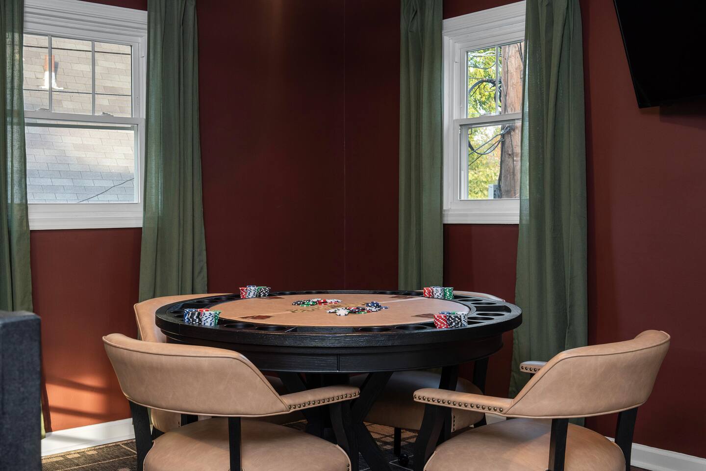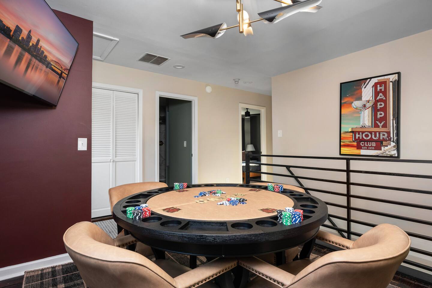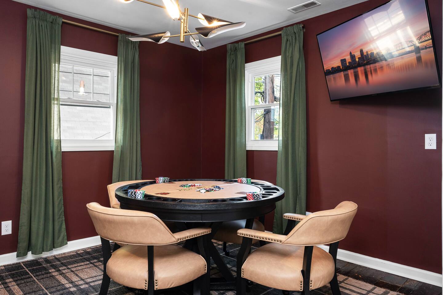 This amazing 2-story, 5-bedroom, 2-bath home offers a bold stay spread throughout 2100-sqft and amazing amenities. The home can handle large groups and families. We have 5 King beds divided among the 1st and 2nd floors. Each room is elegantly designed with high-end finishes. The rear of the home is large and open. The sitting area around our natural gas fire pit has an abundance of comfy seating. You'll also find a hot tub for those who want to take a dip plus a putting green for those want to stay dry. If that's not your thing, you can grill and chill sitting at your own picnic table featuring a solar-powered umbrella. Inside each bedroom has its own TV for privacy. On the 2nd floor the game room has its own 55" tv waiting along with a full poker table. 7 TVs in all throughout the home!