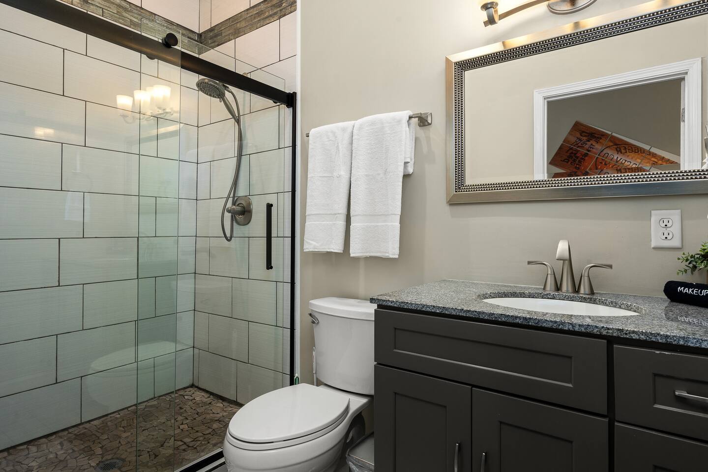 This amazing 2-story, 3-bedroom, 2 bath home offers a bold stay spread throughout 1400+sqft and amazing amenities. The home can handle large groups and families. We have 4 Queen sized beds divided among the 1st and 2nd floors. Each room is designed with high-end finishes. The rear of the home is very open. The deck grill overlook the yard. There you'll find a covered hottub with seating near it where those who want to take a dip can talk to those who want to stay dry. Not far away is the fire pit with Adirondack chairs surrounded by trees for privacy.