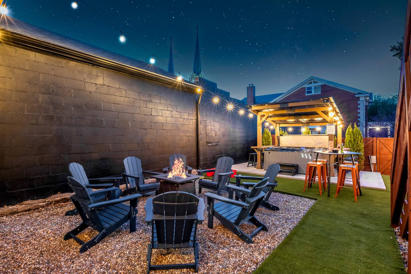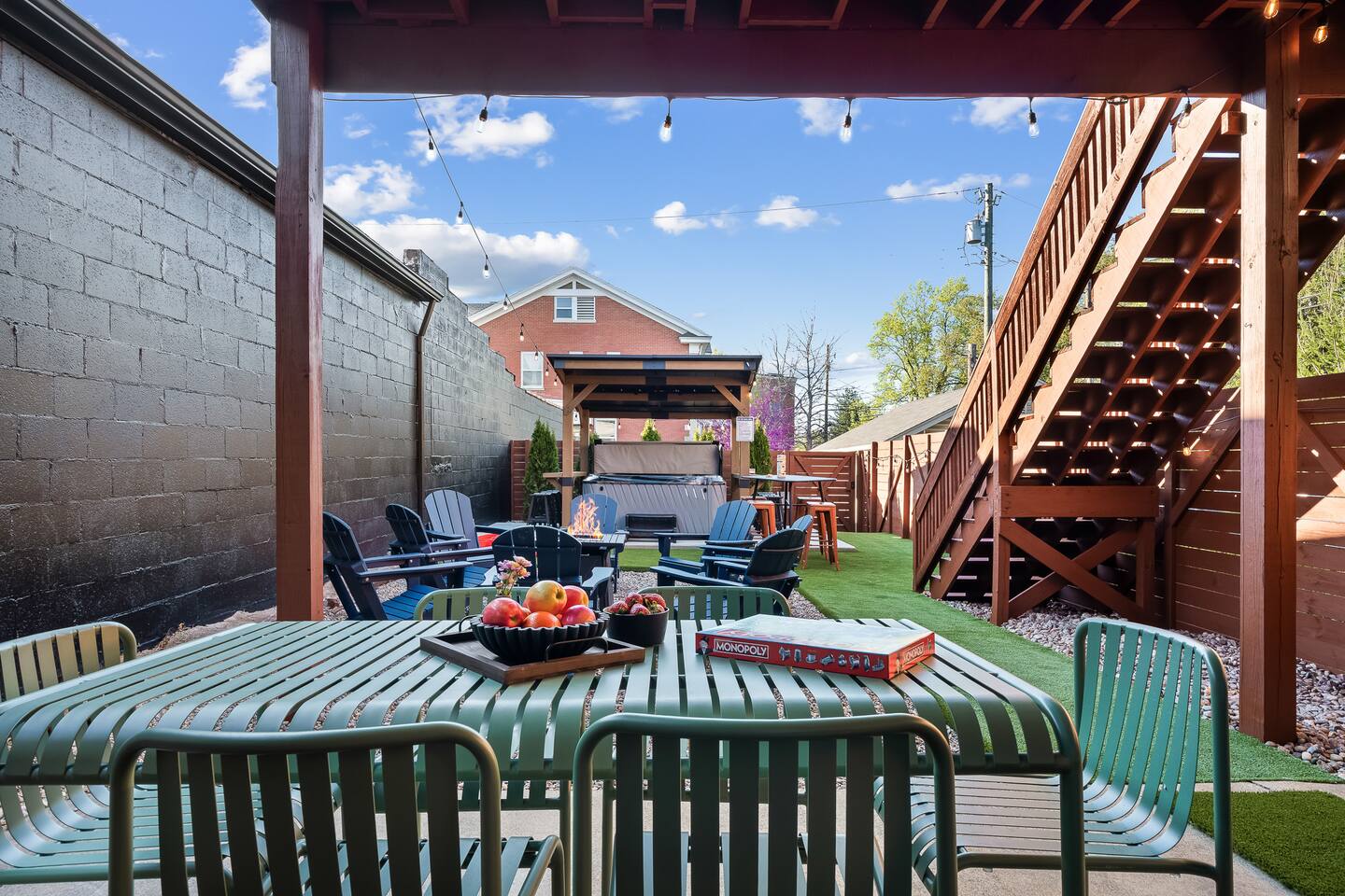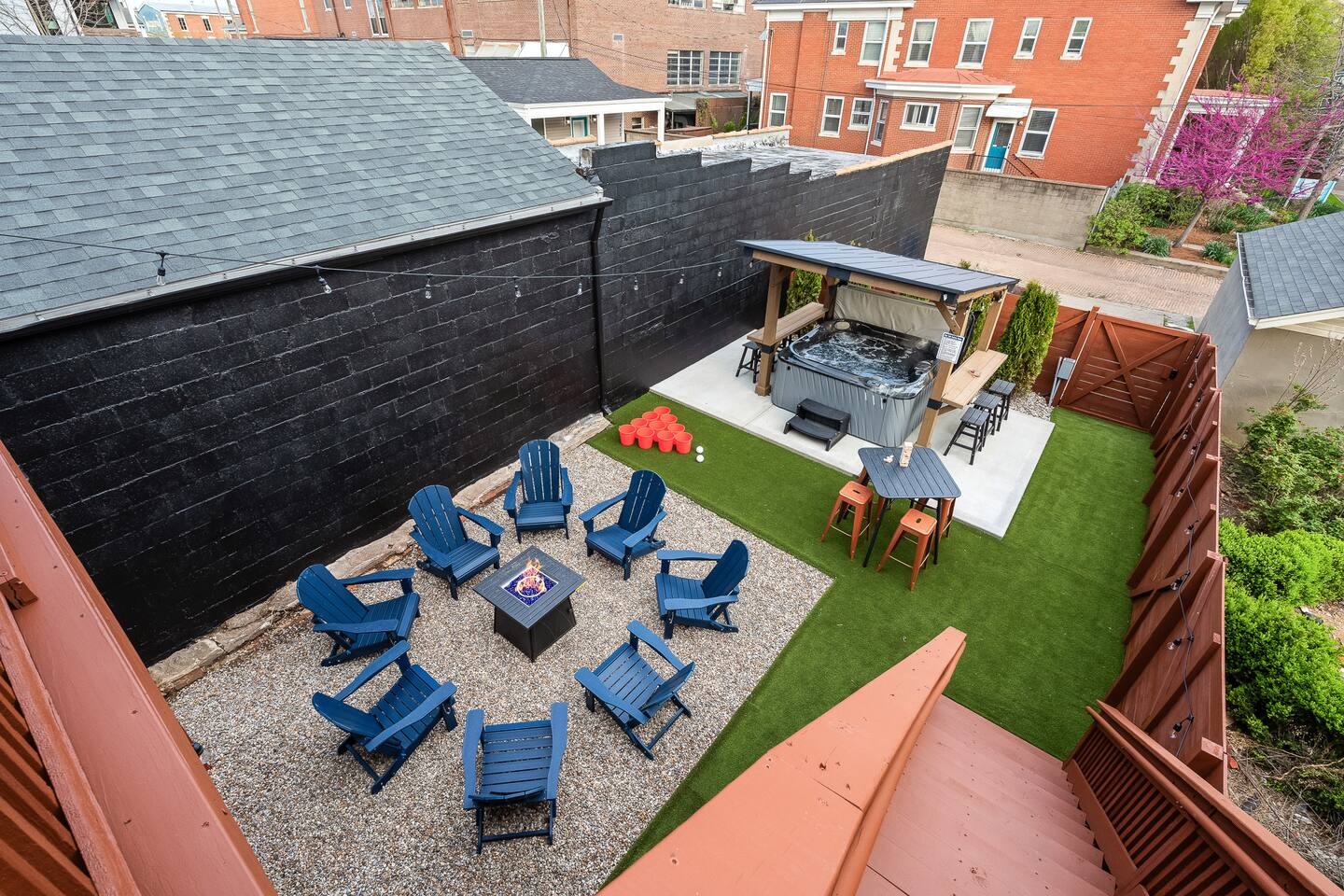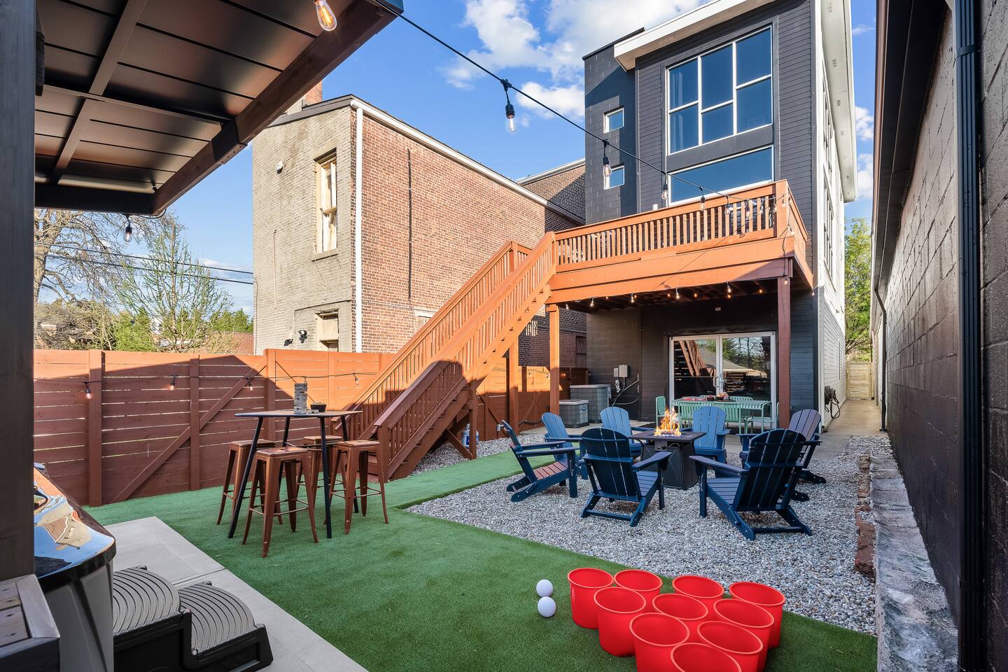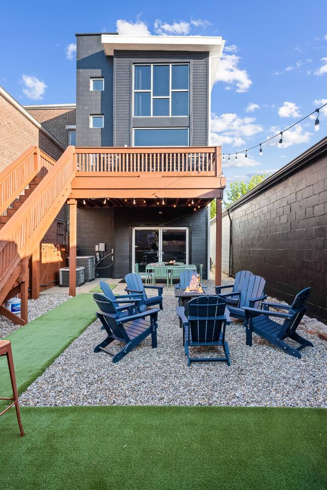 This amazing 3-story, 6-bedroom, 4.5- bath home offers a bold stay spread throughout 3000sqft and amazing amenities. The home can handle large groups and families. We have 3 King, 2 Queen and 2 Full sized beds divided among the 1st and 3rd floors. Each room is elegantly designed with high-end finishes. The 3rd floor bedrooms all feature walls of windows facing west towards downtown. The full bathrooms have been completely reconstructed and feature high end finishes. The rear of the home is large and open. The expansive deck with its outdoor couch and Weber grill overlooks the expansive yard. There you'll find a covered hottub with bench seating around it where those who want to take a dip can talk to those who want to stay dry. Not far away is the fire pit with Adirondack chairs and a table where you can challenge your friends to bourbon-pong. Inside each bedroom has its own TV for privacy. On the 2nd floor the living room has its own 65" tv waiting for you while right next to it is the kitchen where you'll find 4 mounted TVs where you can watch multiple channels. 11 TVs in all throughout the home!
