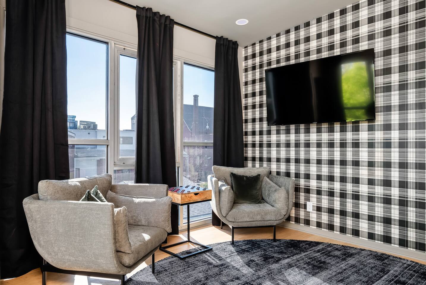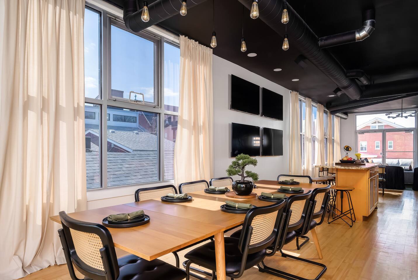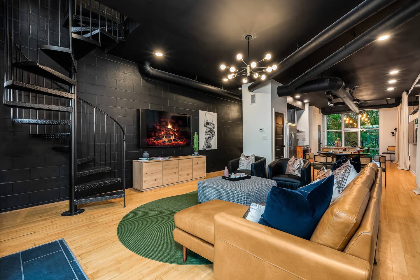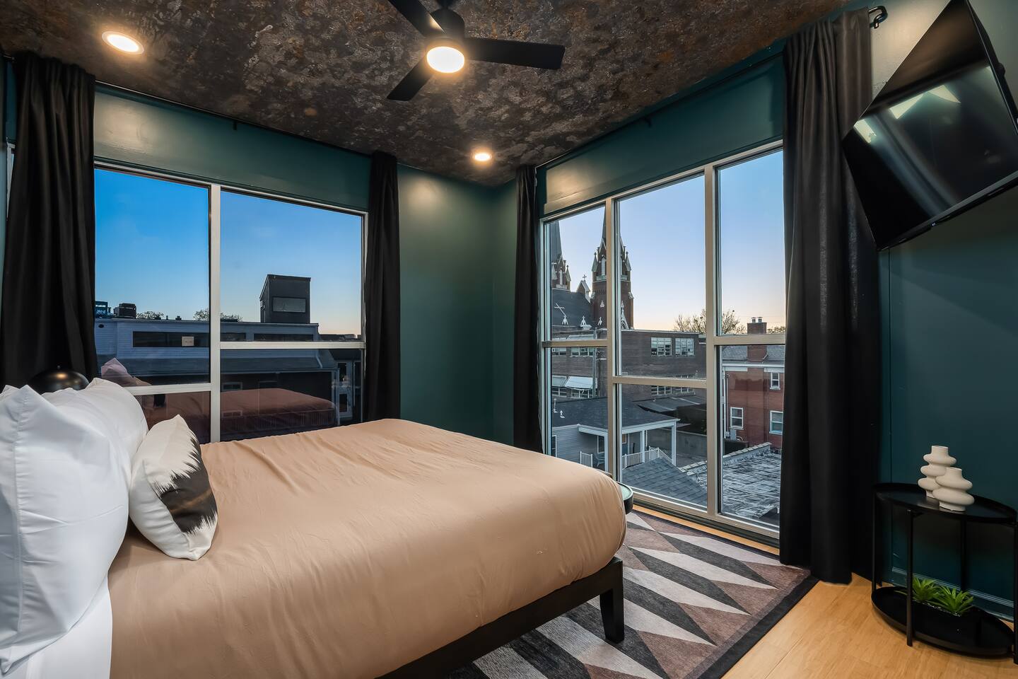 This amazing 3-story, 6-bedroom, 4.5- bath home offers a bold stay spread throughout 3000sqft and amazing amenities. The home can handle large groups and families. We have 3 King, 2 Queen and 2 Full sized beds divided among the 1st and 3rd floors. Each room is elegantly designed with high-end finishes. The 3rd floor bedrooms all feature walls of windows facing west towards downtown. The full bathrooms have been completely reconstructed and feature high end finishes. The rear of the home is large and open. The expansive deck with its outdoor couch and Weber grill overlooks the expansive yard. There you'll find a covered hottub with bench seating around it where those who want to take a dip can talk to those who want to stay dry. Not far away is the fire pit with Adirondack chairs and a table where you can challenge your friends to bourbon-pong. Inside each bedroom has its own TV for privacy. On the 2nd floor the living room has its own 65" tv waiting for you while right next to it is the kitchen where you'll find 4 mounted TVs where you can watch multiple channels. 11 TVs in all throughout the home!